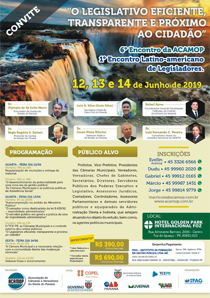 Como representante das Câmaras Municipais e preocupada com o desenvolvimento do trabalho de cada vereador, a ACAMOP , esta organizando o 6° Encontro da entidade em \foz do Iguaçu/PR, com temas relevantes para os parlamentares municipais possam desenvolver um trabalho efetivo e transparente. O tema do 6° Encontro da ACAMOP é ” O legislativo eficiente, transparente e próximo ao cidadão”.