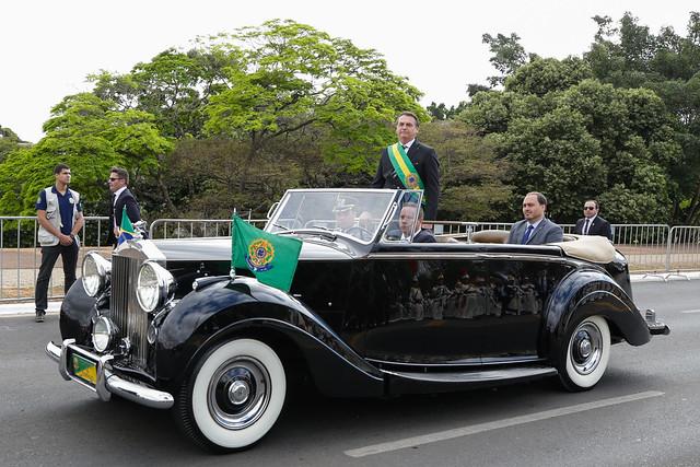 O desfile, — que começou as 9h e tem previsão de término por volta das 11h —, foi interrompido pela quebra de script de Bolsonaro, que foi acompanhado atentamente pelo público aos gritos de “mito”. O presidente chegou às 8h47min ao local, onde o aguardava o Rolls Royce presidencial, de 1952. No carro, estava também o filho do presidente, Carlos Bolsonaro.