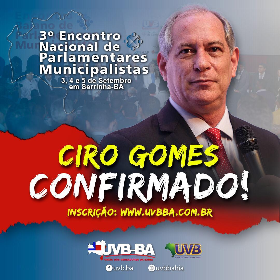 Um dos participantes do evento é o ex-governador do Ceará e ex-ministro da Fazenda, Ciro Gomes, (PTD), que vai fazer a abertura do Encontro junto com a presidente da União de Vereadores da Bahia, Edylene Ferreira. A UVB Brasil, será representada pelo Superintende da UVB Nordeste, vereador Anízio Amorim.