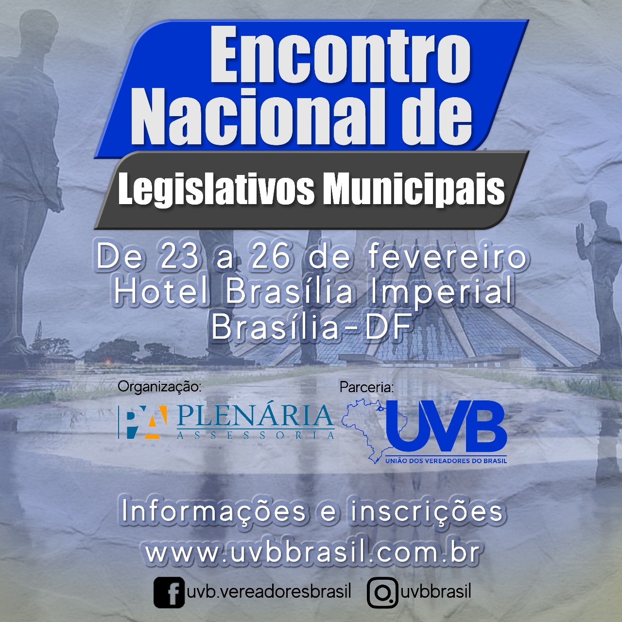 BRASÍLIA/DF – Acontece de 23 a 26 de fevereiro em Brasília, o Encontro Nacional de Legislativos Municipais, promovido pela Plenária em parceria com a UVB.
