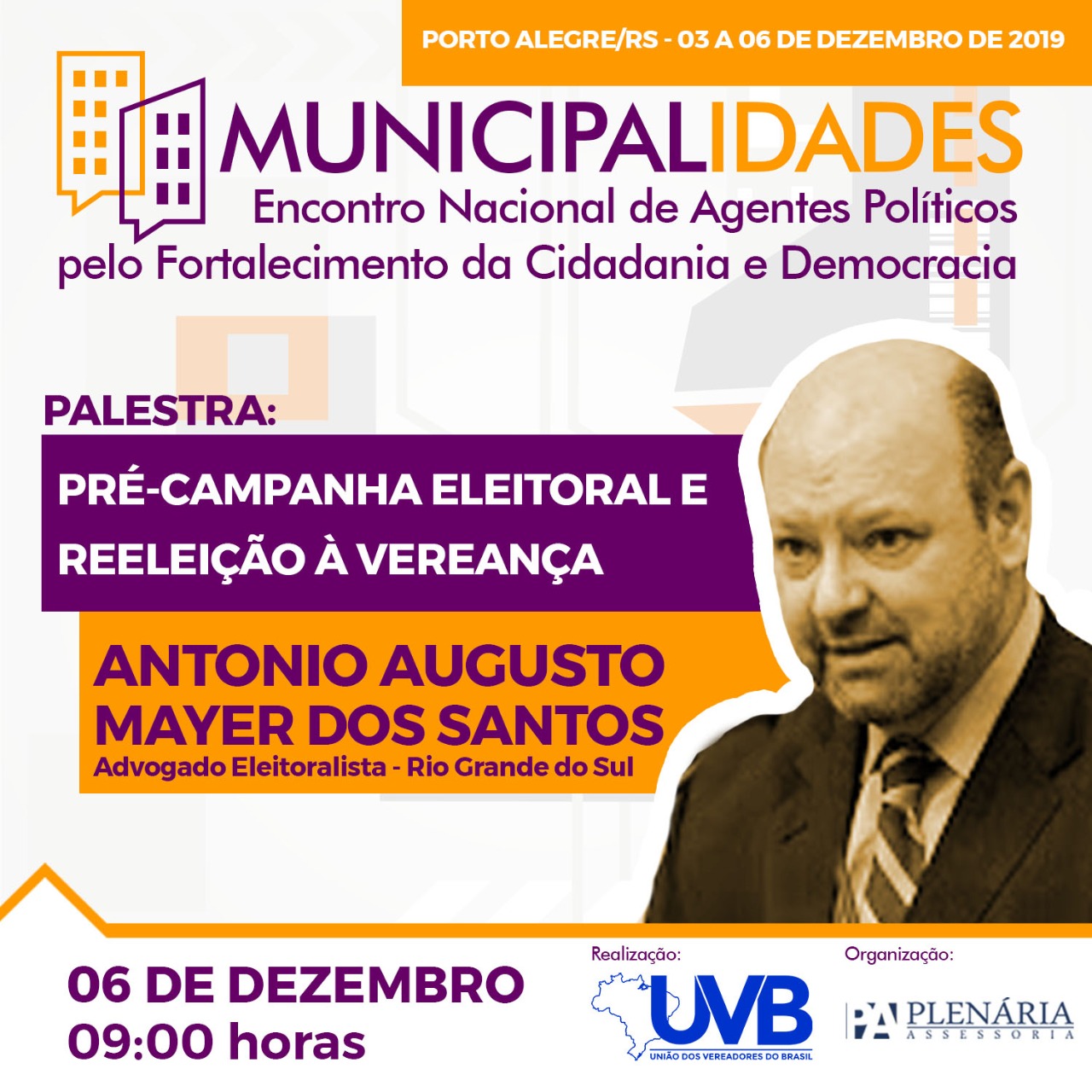 Na oportunidade irá apresentar palestra sobre Pré-Campanha Eleitoral e Reeleição à Vereança; Extinção das Coligações Proporcionais e Propaganda da Majoritária; “Candidaturas Laranjas” a partir das recentes decisões do TSE e Condutas vedadas aos Vereadores em Período Eleitoral.