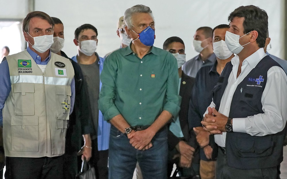 O presidente Jair Bolsonaro, o governador Ronaldo Caiado e o ministro Henrique Mandetta visitaram a obra de um hospital em Goiás neste sábado (11) — Foto: Marcos Corrêa/PR
