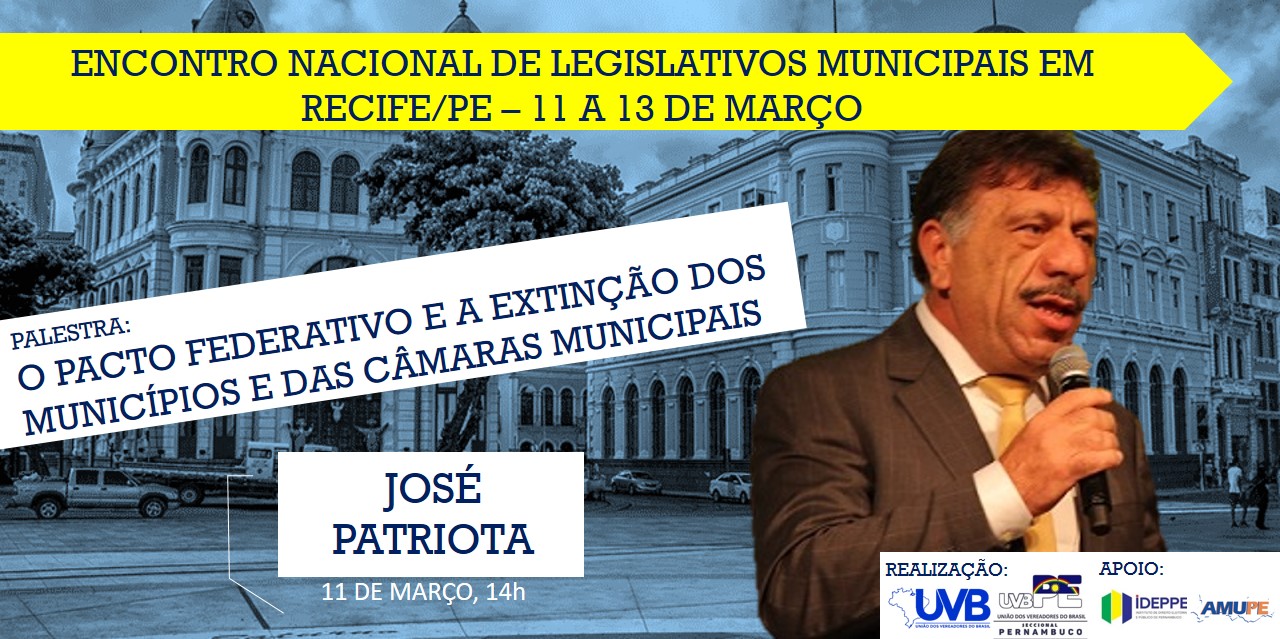 O pacto Federativo e a Extinção dos Municípios  e das câmaras municipais será o tema do presidente  da Associação Municipalista de Pernambuco( AMUPE) José Patriota que já foi Vereador por três mandatos, de 1982 à 1996 ,Secretário Estadual de Articulação Regional, no Governo de Pernambuco, na gestão do Governador Eduardo Campos e nas eleições de 2016, foi candidato à reeleição à Prefeitura de Afogados da Ingazeira, pelo PSB. Eleito no 1º turno, com 83,25% dos votos válidos, sendo a segunda maior votação do Estado de Pernambuco.