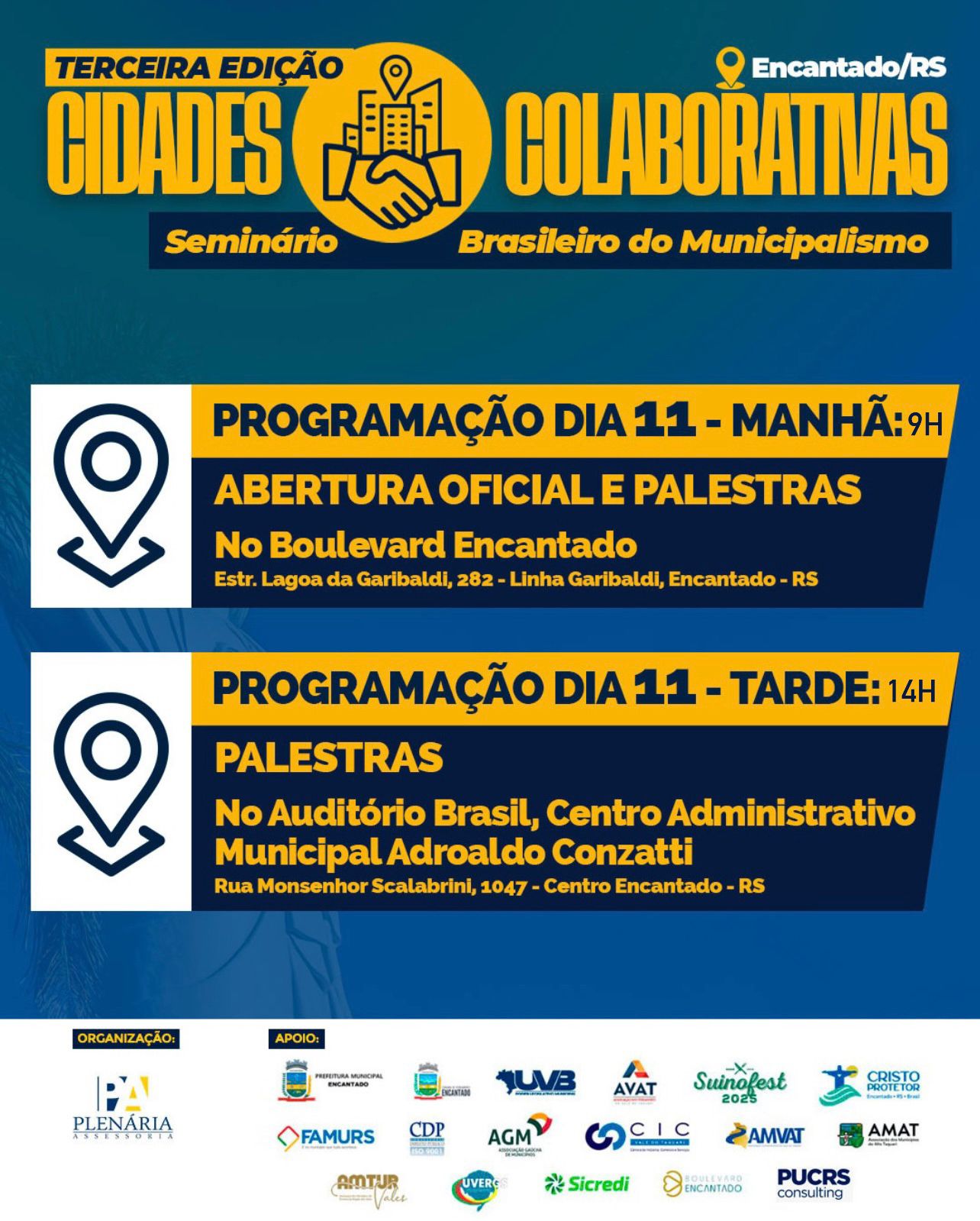 a partir das 14h todas as palestras serão redirecionadas para o auditório Brasil, no Centro Administrativo Municipal Adroaldo Conzatti.