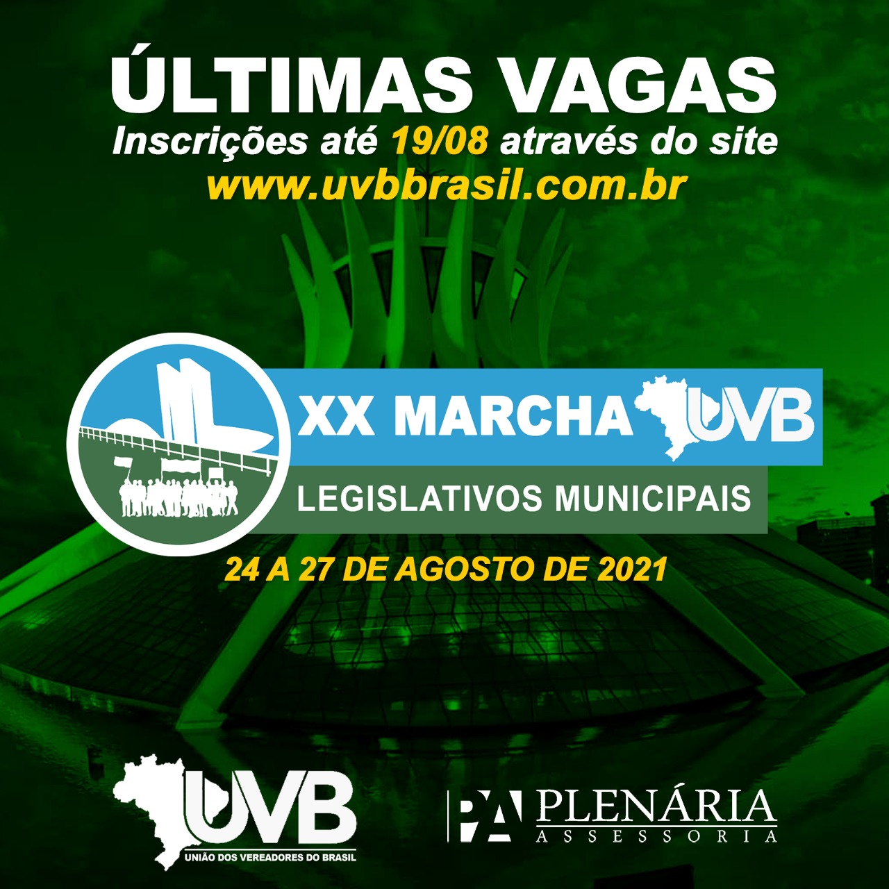 Na XX edição da Marcha dos Legislativos realizada pela União dos Vereadores do Brasil/UVB, em respeito as medidas de prevenção e combate à COVID-19, protocolos sanitários exigidos pela OMS e Governo do Distrito Federal, comunica que para evitar tumultos, as inscrições para a marcha não serão aceitas no local do evento, somente mediante ao site da UVB ate o dia 19/08.