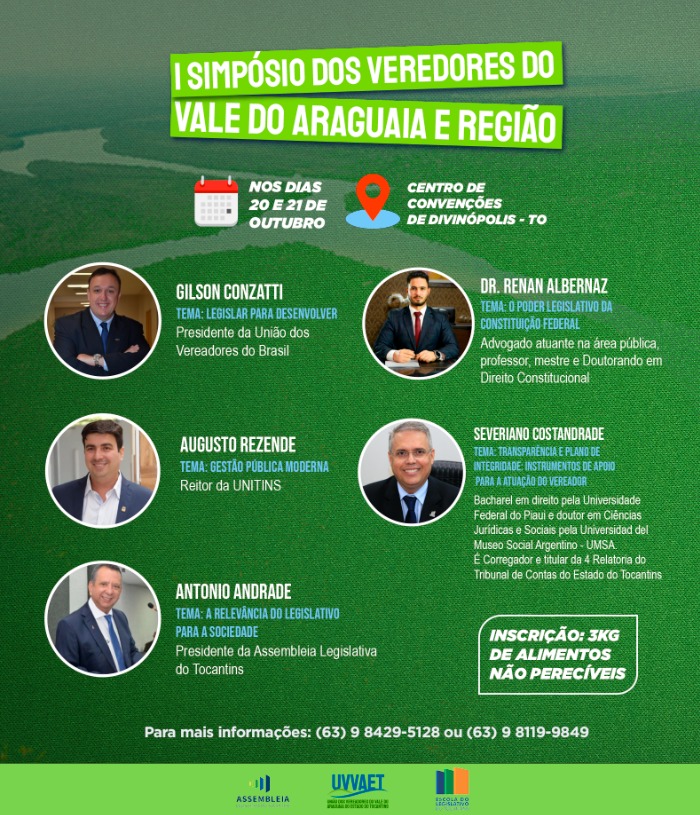 A União dos Vereadores do Vale do Araguaia (UVVAET) realiza na quarta-feira, 20, e quinta-feira, 21, o primeiro simpósio da entidade voltada para a capacitação de parlamentares. O evento será realizado no Centro de Convenções de Divinópolis, sendo que o ingresso é 3 quilos de alimentos não perecíveis.